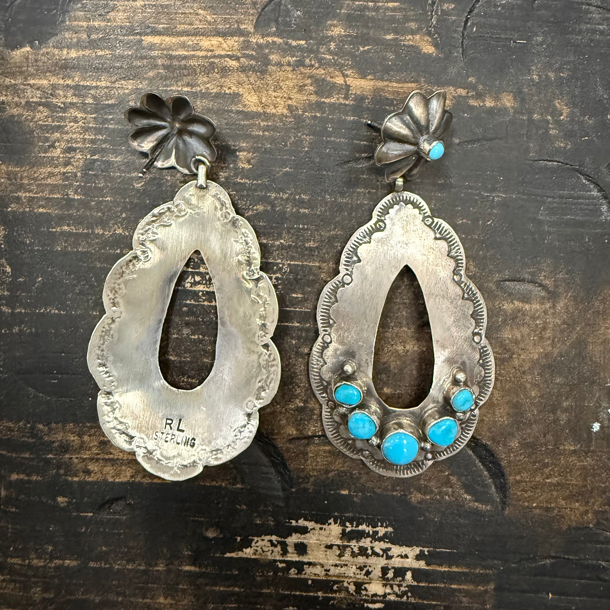 Expertly crafted by a skilled artisan, these concho earrings feature brushed sterling silver and turquoise stones. The intricate design dangles elegantly from a sterling silver post. Each piece is hallmarked by artisan and stamped 'sterling silver' for authenticity. Elevate your style with these unique and handcrafted earrings.